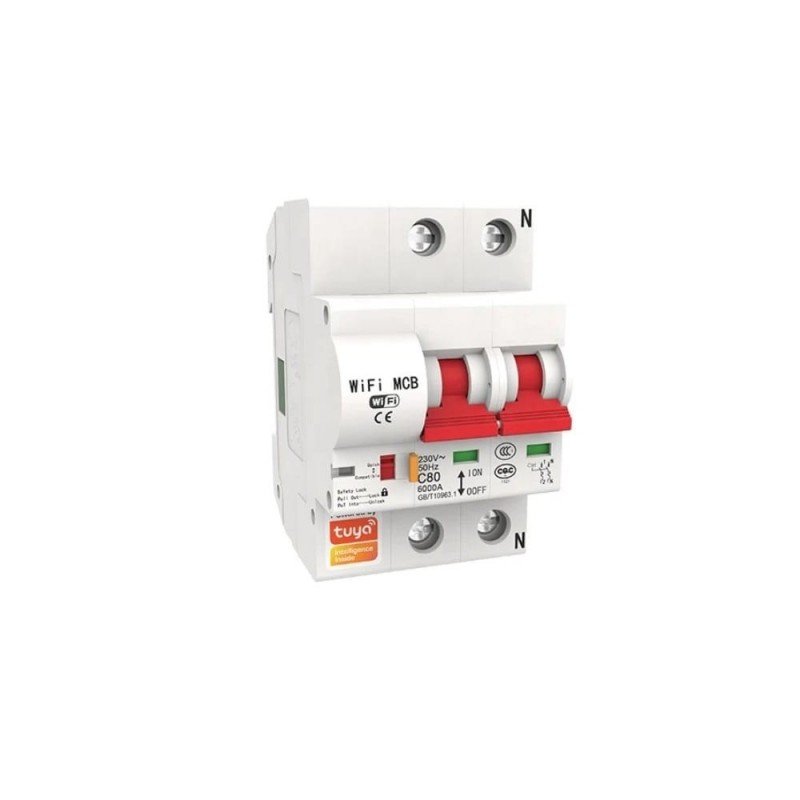 TUYA Išmanusis 2 kanalų jungiklis elektros prietaisams, palaikantis valdymą nuotoliniu būdu per Wi-Fi su TuyaSmart and SmartLife programėlėmis; tvirtinamas ant DIN bėgio.