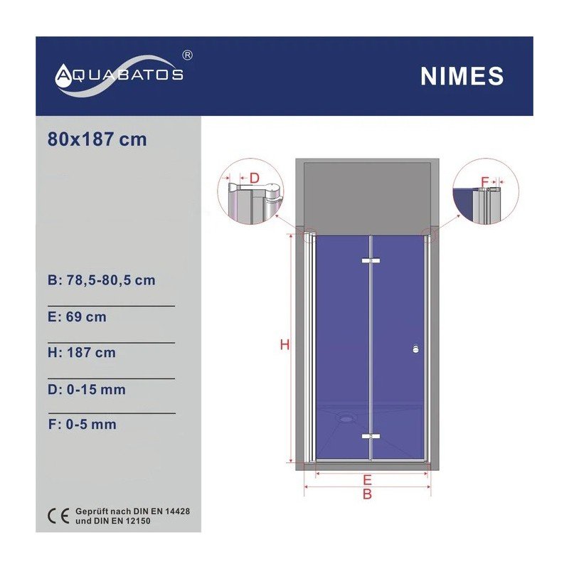Anoduoti chromo spalvos aliuminio profiliai atsparūs trinčiai ir dilimui. Durų pločio reguliavimo diapazonas: 78,5-80,5 cm