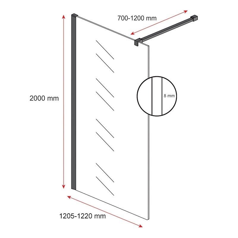 Pilkos (gun grey) spalvos aliuminio profilis. Sienelės pločio reguliavimo diapazonas montuojant: 120,5-122 cm