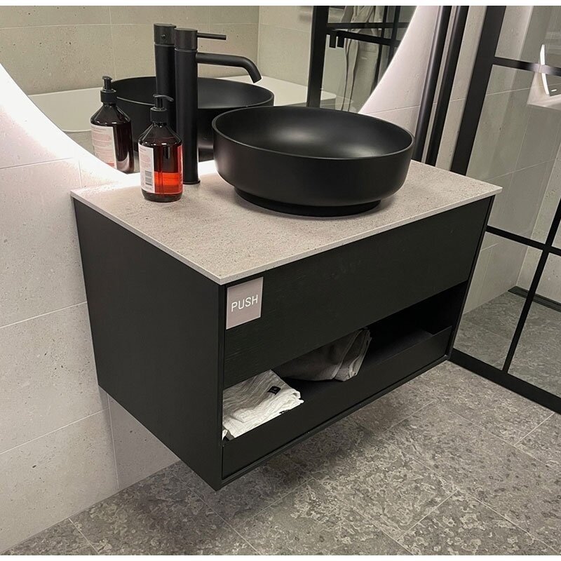 Medžiaga: kompozitinis akmuo. Spalva - juoda. Ši medžiaga yra vienalytė per visą storį – neturi porų ar sluoksnių.