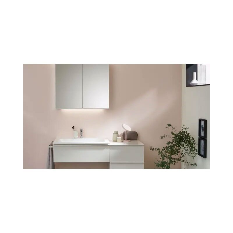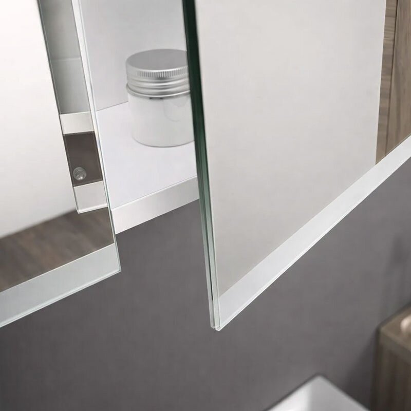 Spintelė su dvejomis dvipusėmis veidrodinėmis durelėmis, viduje yra 2 mobilios stiklinės lentynėlės.