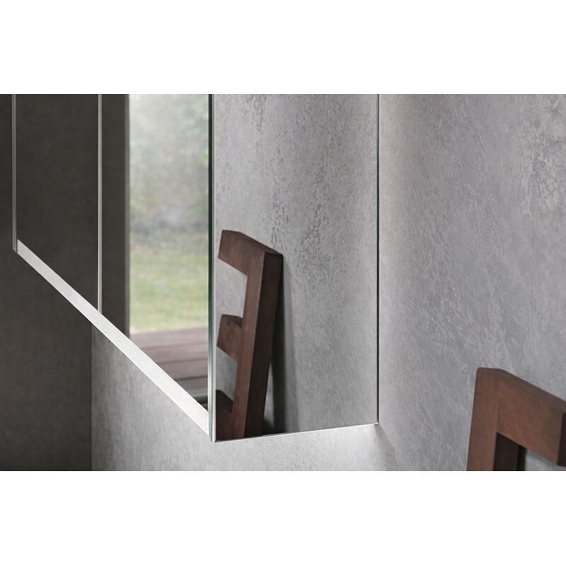 Spintelės korpuso šonai - veidrodiniai, vidus - tamsiai pilkos spalvos. Medžiaga - didelio tankio trijų sluoksnių medienos drožlių plokštė.