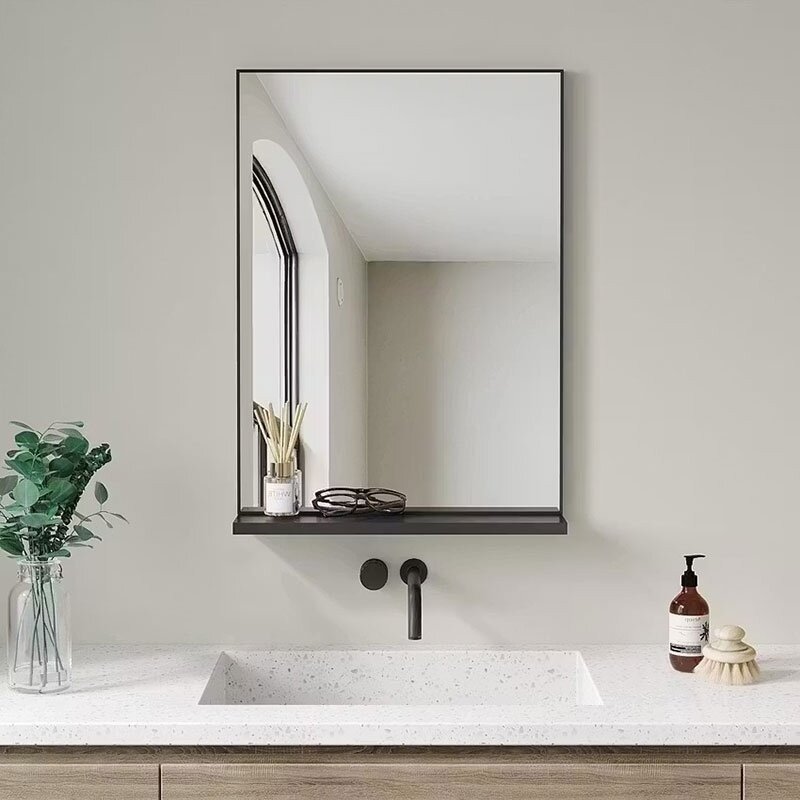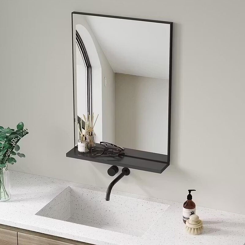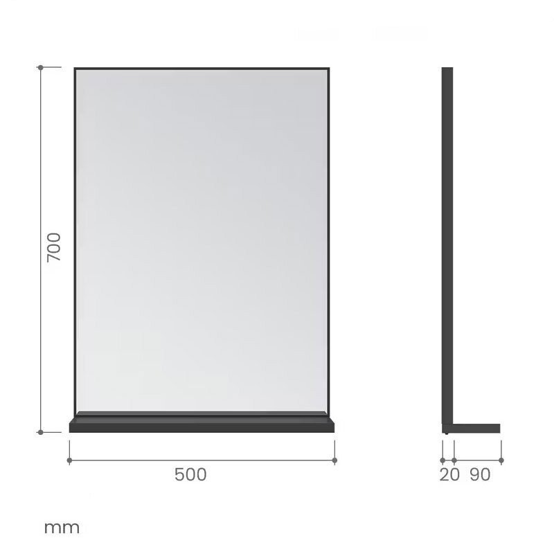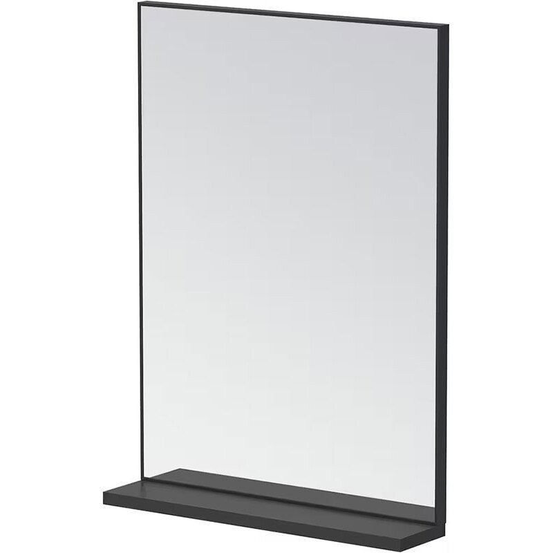 Veidrodis įrėmintas juodos spalvos aliuminio rėmeliu. Veidrodžio apačioje yra praktiška lentynėlė vonios aksesuarams susidėti. Lentynėlės gylis: 9 cm